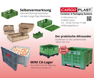 | Cargo Plast GmbH | Germany | Plastic containers/boxes, reusable packaging materials/containers, advice, measuring instruments/climate data, labels, shop fitting/planning/furnishing, thermal boxes/transport containers, harvesting aids/harvesting systems, cooling, storage, marketing | Plastic containers/boxes, Packaging material Reusable/-containers, Consulting, Measuring devices/climate data, Labels, Shop fitting/planning/decoration, Thermo boxes/transport containers, Harvesting aids/harvesting systems, Cooling, Storage, Marketing |